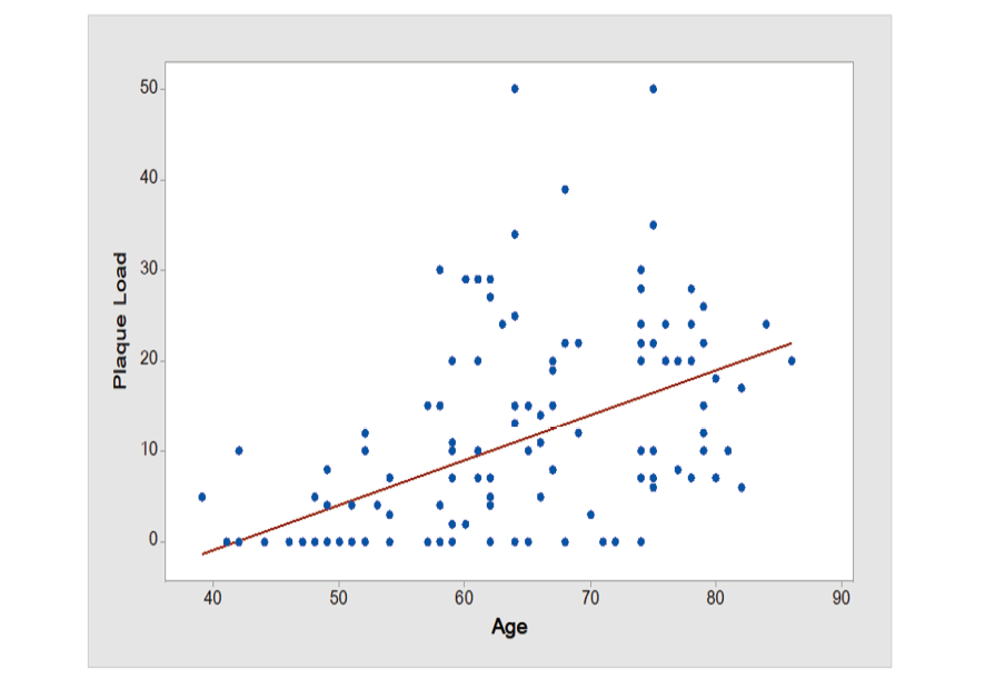 Figure 1. Distribution of coronary plaque burden according to age (line regression and R2 = 0.20)