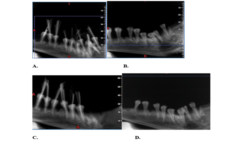 Figure 1. CBCT images of the teeth; (A) presence of broken file + obturation, (B) presence of broken file, no obturation. (C) absence of broken file + obturation, (D) absence of broken file, no obturation