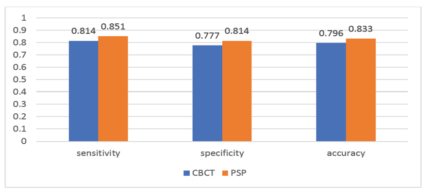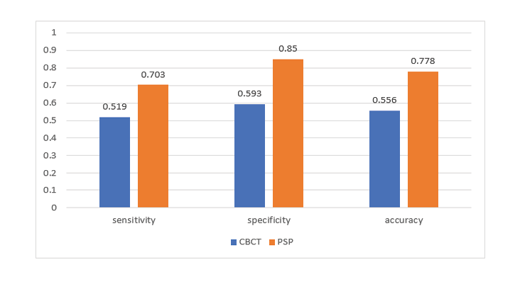Figure 2. Sensitivity, specificity and accuracy of CBCT and PSP digital radiography in detection of broken NiTi files in root canals filled with gutta-percha