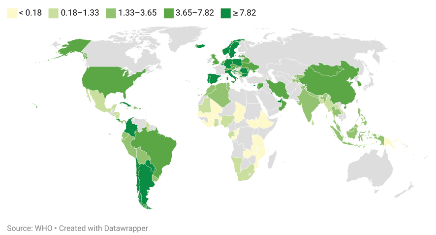 Figure 2. Global distribution of dental workforce density per 10,000 population.