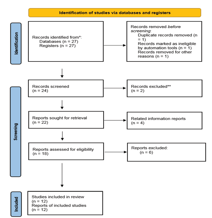 In the Figure below (Figure-1), the steps of selecting and reviewing articles are shown in Figure-1. In this review, 27 records were identified from databases and 27 records from registers. After a thorough assessment, 12 studies were deemed eligible for inclusion in the review. Additionally, 12 reports of the included studies were evaluated and utilized. The results are presented in Table-1.