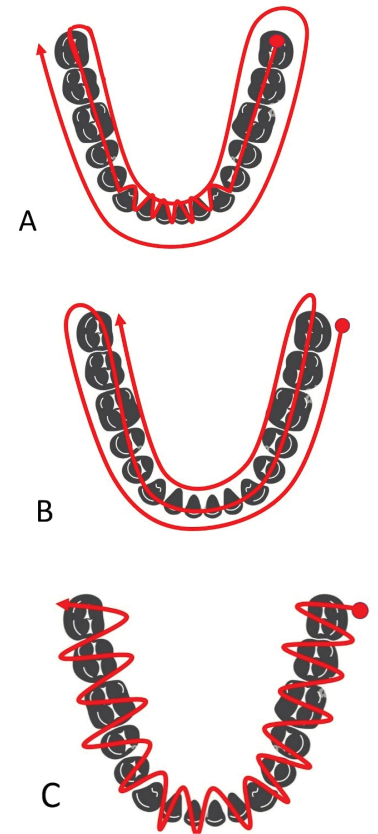 Figure 1. Scanning strategies (A) occlusal surfaces from the left end to the right end, followed by lingual and then buccal surfaces, (B) buccal surfaces followed by occlusal and then lingual surfaces, and (C) scanning was performed with a continuous labiolingual movement with left-to-right direction