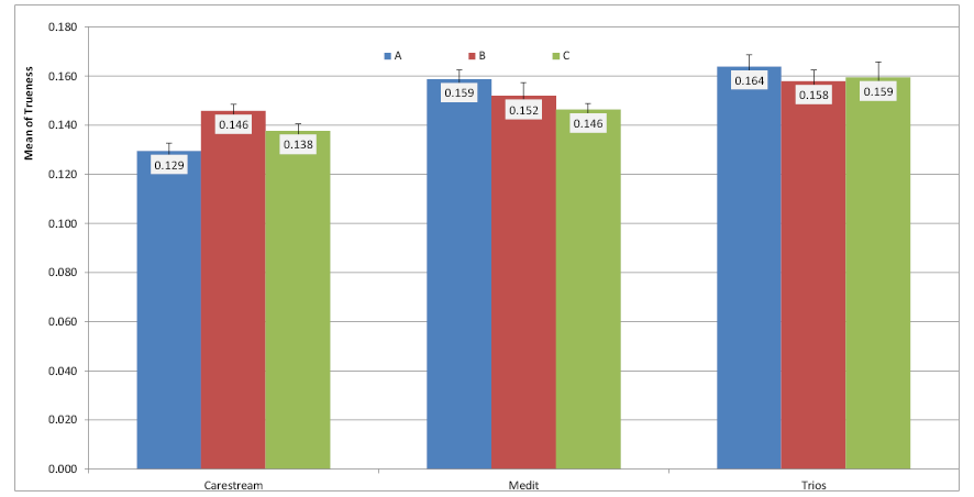 Figure 3. Bar chart of the mean trueness of the three scanners with different scanning strategies