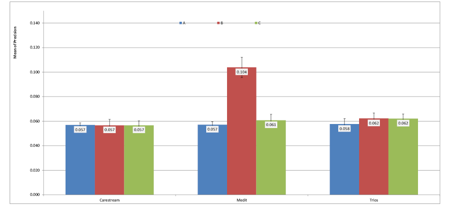Figure 4. Bar chart of the mean precision of the three scanners with different scanning strategies