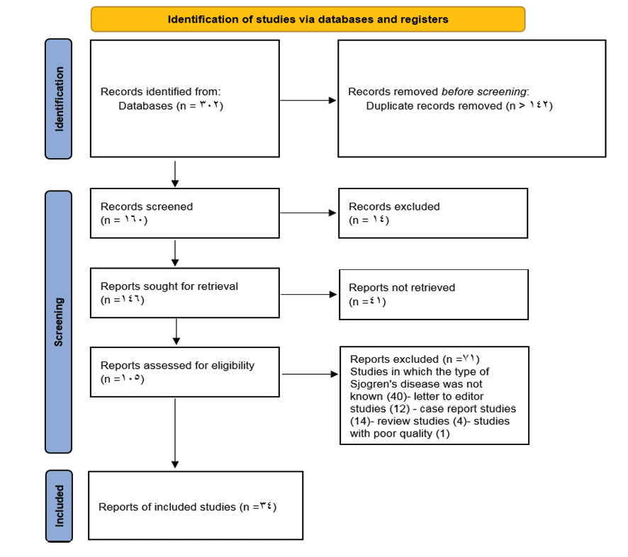 There was a total of 302 studies at the initial stage. The study titles were screened, and 142 duplicate studies were removed. Abstracts of studies were assessed, and we excluded 14 studies because they did not have full text. The full text of the remaining 61 articles was evaluated; then41 studies without essential data were excluded. Seven further studies were excluded based on other items from the exclusion criteria, and 34 articles entered the systematic review and meta-analysis (Figure-1). This meta-analysis included 34 observational studies involving a population sample of 9535 individuals. Of these 34 studies, 26 were cohort studies, 5 were case-control studies, and 3 were cross-sectional studies. The studies were published from 1985 to 2024 (Table-1).