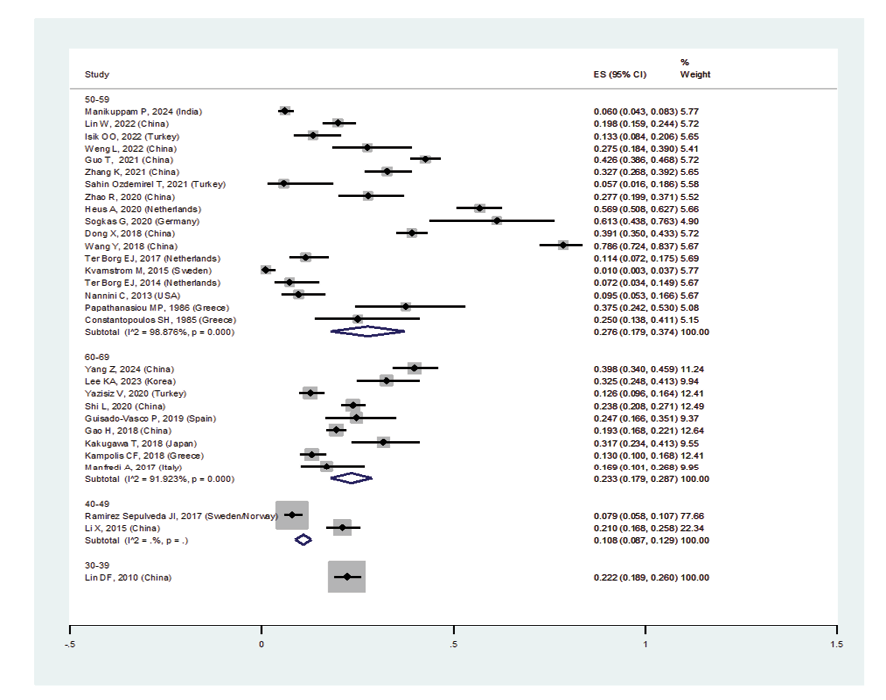 Figure 2 D. Forest plot related to the prevalence of ILD D: in patients with pSS by age group