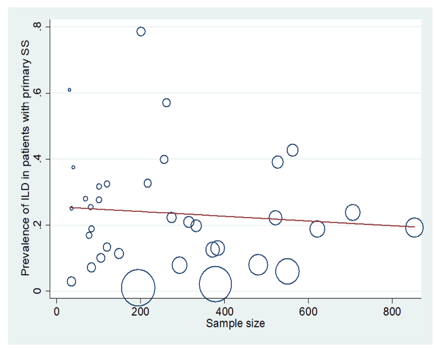 Figure 4. Meta-regression plot of the relationship between “prevalence of ILD in patients with pSS” and the sample size of studies
