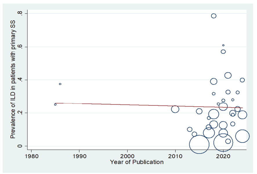 Figure 5. Meta-regression plot of the relationship between “prevalence of ILD in patients with pSS” and year of publication