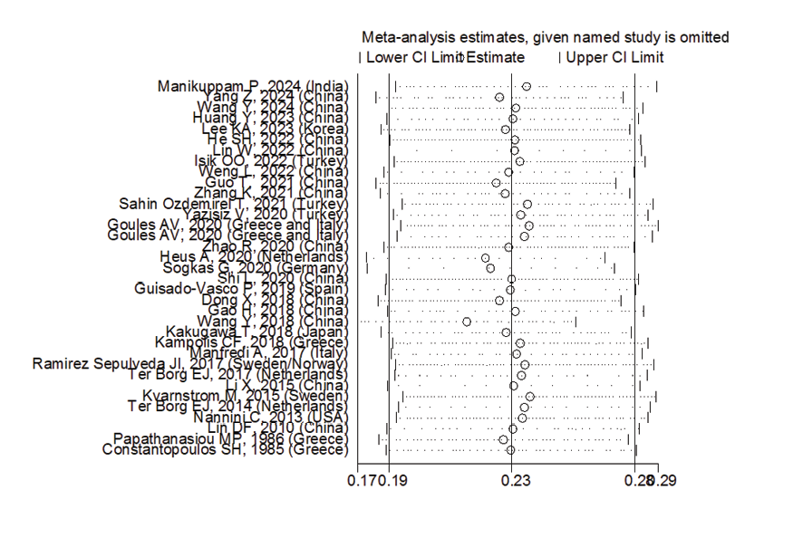 Abstract Background: Interstitial Lung Disease (ILD) is the most common pulmonary manifestation in patients with primary Sjögren’s syndrome. Therefore, this study aimed to investigate the prevalence of ILD in patients with primary Sjögren’s syndrome (pSS) using a systematic review and meta-analysis method. Materials and Methods: This study searched databases ProQuest, PubMed, Web of Science, Cochrane, Embase, and the search engine Google Scholar until February 8, 2025. Studies were combined using the sample size and variance of each study. The heterogeneity of the studies was examined using the Q Cochrane test and the I2 index. The significance level of the tests was considered P<0.05. Results: 34 observational studies, with a total of 9535 individuals, showed that the prevalence of ILD in all patients with pSS was 23.5% (95%CI: 18.6%, 28.4%), in women 31.2% (95%CI: 18.4%, 44.1%), and in men 45.5% (95%CI: 23.6%, 67.4%). Moreover, the prevalence of ILD in patients with pSS in the age group of 30 to 39 years was 22.2% (95%CI: 18.9%, 26%), 40 to 49 years 10.8% (95%CI: 8.7%, 12.9%), 50 to 59 years 27.6% (95%CI: 17.9%, 37.4%), and 60 to 69 years 23.3% (95%CI: 17.9%, 28.7%). Also, the prevalence of ILD in patients with pSS in case-control studies was 15.6% (95%CI: 7.1%, 24.1%), in cohort studies 25.7% (95%CI: 19%, 32.4%), and in cross-sectional studies 21.4% (95%CI: 11.9%, 31%). However, the prevalence of non-specific interstitial pneumonia (NSIP) was 48.8% (95%CI: 41.4%, 56.2%), usual interstitial pneumonia (UIP) 15% (95%CI: 10.5%, 19.5%), LIP 10.8% (95%CI: 6.6%, 15%), and organizing pneumonia (OP) 9.4% (95%CI: 5.4%, 13.4%). Conclusion: One out of every four patients with pSS has ILD, and the prevalence of ILD was higher in men than in women. Moreover, the most common type of ILD was NSIP, followed by UIP, OP, and LIP, and the highest prevalence of ILD was in the age group of 50 to 59 years. Evaluating further studies regarding the impact of various factors on ILD can help in better diagnosing it in patients. [GMJ.2025;14:e3752] DOI:3752 Keywords: Primary Sjogren’s Syndrome; Primary Sicca Syndrome; Prevalence; Lung Diseases; Interstitial; Interstitial Lung Disease; Interstitial Pneumonia |