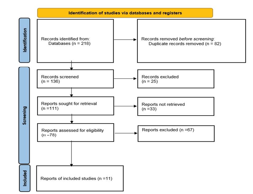 After searching databases and Google Scholar, 218 studies were found. Of these, 82 were duplicates and were removed. Then, 136 studies entered the next stage, and after reviewing the information in the abstracts, 25 studies, whose abstract information was incomplete and did not have a full text, were removed. The full text of 111 studies was reviewed, and 33 studies that had not reported the necessary data for data analysis were removed. Consequently, 67 studies were removed based on other exit criteria, and 11 studies remained (Figure-1).