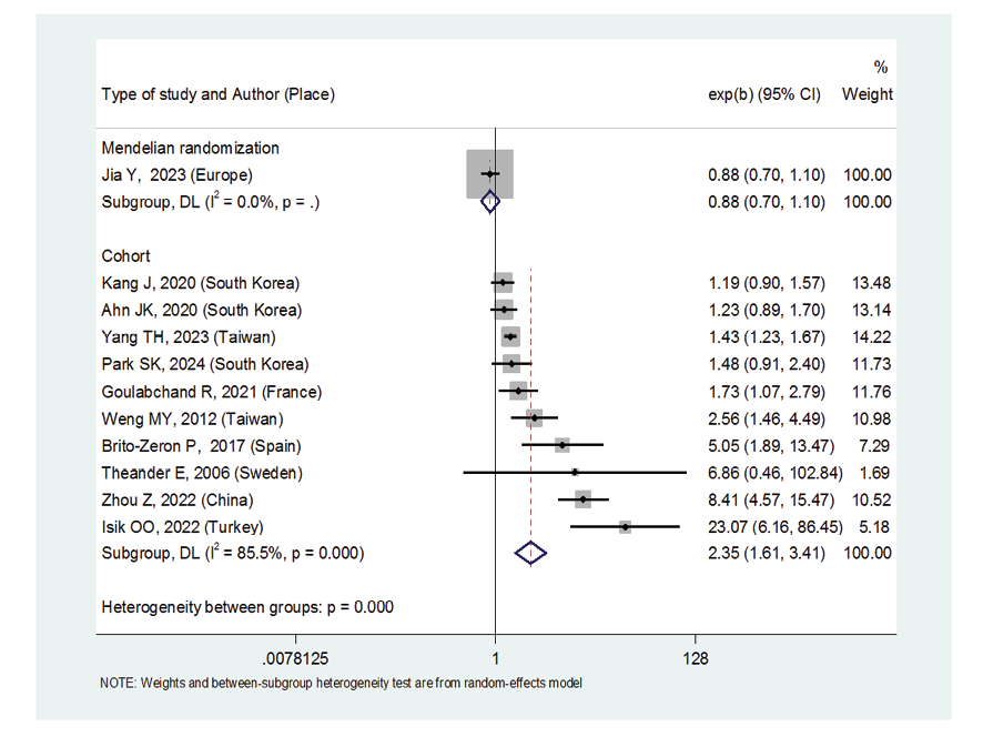 Figure 4. Forest plot related to the association between Sjogren's syndrome and thyroid cancer risk by type of study