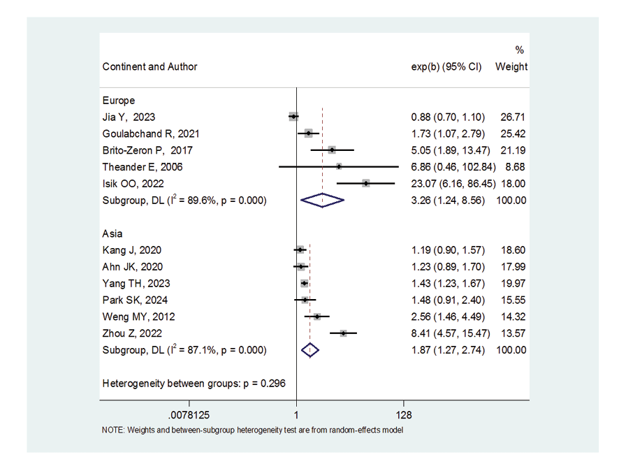 Figure 5. Forest plot related to the association between Sjogren's syndrome and thyroid cancer risk by continent