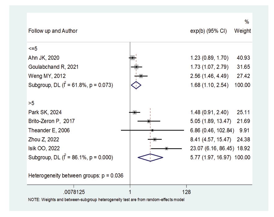 Figure 6. Forest plot related to the association between Sjogren's syndrome and thyroid cancer risk by follow up