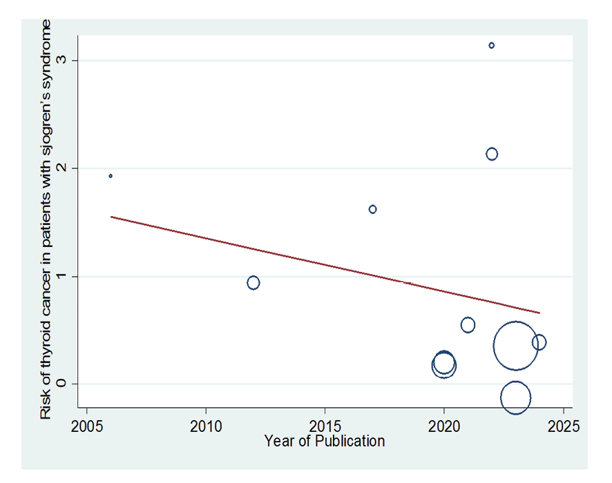 Figure 8. Meta-regression plot of the relationship between “association between Sjogren's syndrome and thyroid cancer risk” year of publication