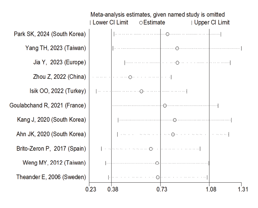 Due to the heterogeneity between studies, a random effects model was used (I2=87.8%). Because when the I2 is greater than 75%, a random effects model is used. The risk of thyroid cancer in patients with Sjögren's syndrome increased in the ages of 40 to 49 years (OR: 1.43, 95%CI: 1.23, 1.67), 50 to 59 years (OR: 4.65, 95%CI: 1.87, 11.58), and 60 to 69 years (OR: 1.34, 95%CI: 1.08, 1.66), showing that patients in their fifth decade of life are more at risk of thyroid cancer (Figure-3). Figure-4 indicated that the relationship between Sjögren's syndrome and the risk of thyroid cancer in the Mendelian randomization study was not statistically significant (OR: 0.88, 95%CI: 0.70, 1.10). However, in cohort studies, the risk of thyroid cancer was significantly increased due to Sjögren's disease. (OR: 2.35, 95%CI: 1.61, 3.41). In examining the continents, it was found that European patients with Sjögren's syndrome (OR: 3.26, 95%CI: 1.24, 8.56) are more at risk of thyroid cancer than Asian patients (OR:1.87, 95%CI: 1.27, 2.74, Figure-5). Patients with Sjögren's syndrome who had a follow-up period of less than or equal to 5 years (OR: 1.68, 95%CI: 1.10, 2.54) and patients with a follow-up period of more than 5 years (OR:5.77, 95%CI: 1.97, 16.97) were at risk of thyroid cancer (Figure-6). Figure-7 demonstrated that patients with primary Sjögren's syndrome were more at risk of thyroid cancer than ordinary people (OR: 2.37, 95%CI: 1.44, 3.90). Since other studies did not specify the type of Sjögren's, no analysis was performed based on patients with secondary Sjögren's syndrome. In the additional analyses section, meta-regression revealed that there was no statistically significant relationship between “the relationship between Sjögren's syndrome and the risk of thyroid cancer” and the year of publication of the studies (P=0.511). Similarly, the relationship between “the relationship between Sjögren's syndrome and the risk of thyroid cancer” and the sample size of the studies was also not statistically significant (P=0.374, Figures-8 and -9). In Figure-10, the sensitivity analysis showed that the study by Zhou et al. in 2022 and the study by Jia et al. in 2023 were the most influential studies in the final result of the current research. Much so that the result of the current research changed to (OR: 0.52, 95%CI: 0.22, 0.81) when the Zhou study was removed. Moreover, the current research's conclusion was also changed to (OR: 0.85, 95%CI: 0.48, 1.23) when the Jia study was removed. The publication bias graph was significant (P=0.026) and showed that studies that did not report a significant association between Sjögren's syndrome and thyroid cancer risk had little chance of being published (Figure-11).