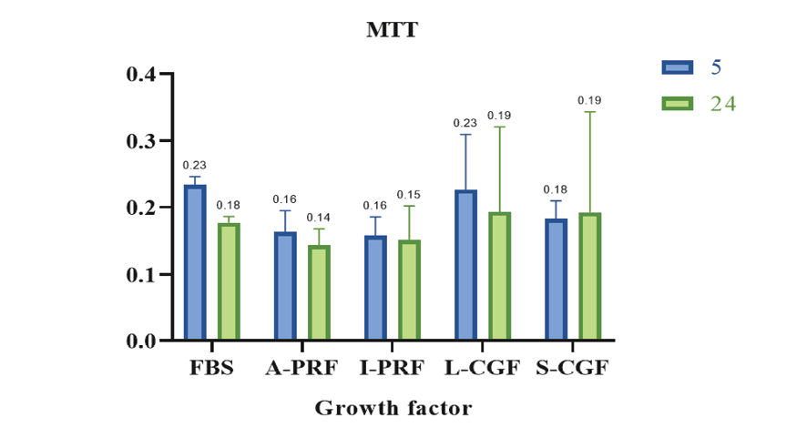 The MTT assay was used to assess the effects of L-CGF, S-CGF, A-PRF, and I-PRF on cell viability and proliferation 24 hours and 5 days after treatment. At each time point, one sample of each group was removed from the incubator, the culture medium was extracted under a biologic hood, and replaced with 200 µL of 10% MTT yellow solution. The plate was then covered with aluminum foil and incubated for 2 to 4 hours. After ensuring the formation of formazan crystals under an inverted microscope, the medium of each well was removed, and 200 µL of dimethyl sulfoxide solvent was added to each well to dissolve the crystals which resulted in appearance of a purple color. Subsequently, 100 µL of each well was added to the 96-well plate of ELISA-Reader, and the spectrophotometric absorbance (optical density) of the reduced MTT was read at 570 and 620 nm wavelengths.