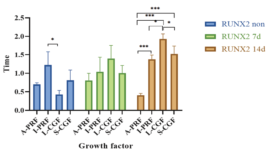 The present results showed that the mean cell proliferation was not significantly different among the study groups, and did not significantly change over time. The highest rate of OCN gene expression in non-osteogenic medium and osteogenic medium at 14 days was recorded in the S-CGF group, while the L-CGF group indicated the maximum amount of expression in the osteogenic group at 7 days. The highest amount of OPN gene expression in non-osteogenic medium was recorded in the I-PRF group, while the S-CGF group indicated the maximum amount of expression in osteogenic group. The highest amount of RUNX2 gene expression in non-osteogenic medium was recorded in the I-PRF group, while the L-CGF group indicated the maximum amount of expression in the osteogenic group. However, the S-CGF, L-CGF, and A-PRF groups showed a significant difference in OCN, OPN, and RUNX2 gene expression.