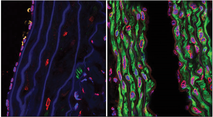 Figure 3. Confocal microscopy photographs of the descending aortas of two 15-month-old progeria mice, one untreated (left picture) and the other treated with the farnesyltransferase inhibitor drug tipifarnib (right picture). The microphotographs show prevention of the vascular smooth muscle cell loss that is otherwise rampant by this age. The staining was smooth muscle alpha-actin (green), lamins A/C (red) and DAPI (blue).