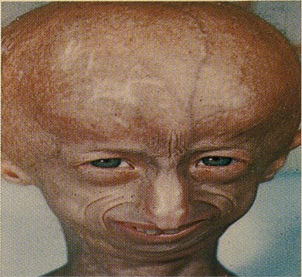 Figure 1. Disproportionate small face relative to the head. The skin appears wrinkled and thin.