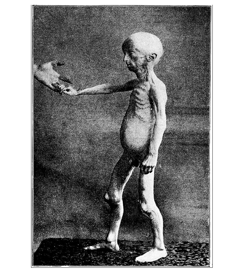 Figure 2. Notice the extreme emaciation and the conspicuous ribs, veins, and tendons. The abdomen is full, and the patellae are pushed forward by the relatively big lower ends of the femora.