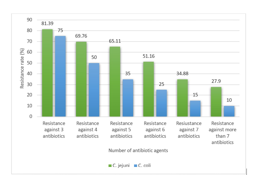 MDR isolates were determined as those harbored simultaneous resistance against at least 3 antibiotic agents. Figure-1 reveals the MDR distribution amongst the Campylobacter isolates. No less than, 81.39% of C. jejuni and 75% of C. coli isolates were strongminded as MDR. The frequency of C. jejuni and C. coli strains with resistance against more than 7 antibiotic agents was 27.90% and 10%, respectively.