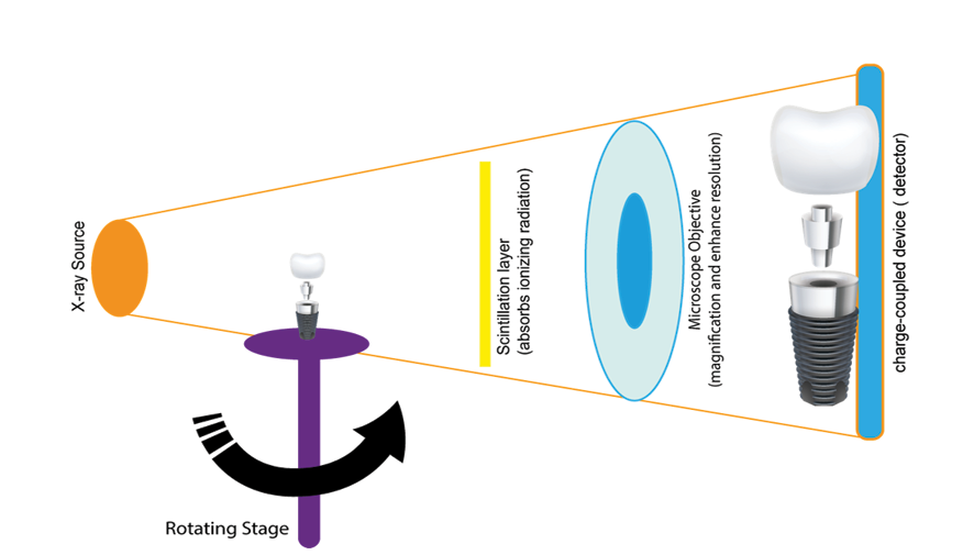 Micro-CT has emerged as a pivotal imaging modality in dental implantology, offering unparalleled insights into bone microarchitecture and implant integration [63] Figure-1 shows the schematic illustration of micro-CT technique [64].