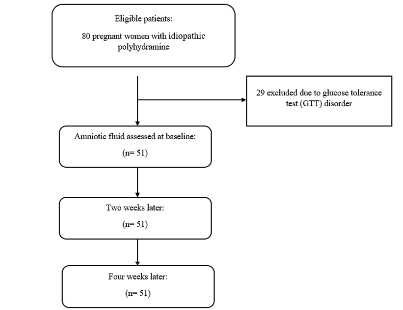 Initially, 80 pregnant women with idiopathic polyhydramnios were screened. At baseline, fasting blood sugar (FBS) and glucose tolerance test (GTT) were assessed to exclude hyperglycemia. Twenty-nine cases were excluded due to abnormal GTT results. Finally, 51 eligible normoglycemic women with idiopathic polyhydramnios were included. AFI was measured at baseline, and again two and four weeks after dietary intervention (Figure-1).