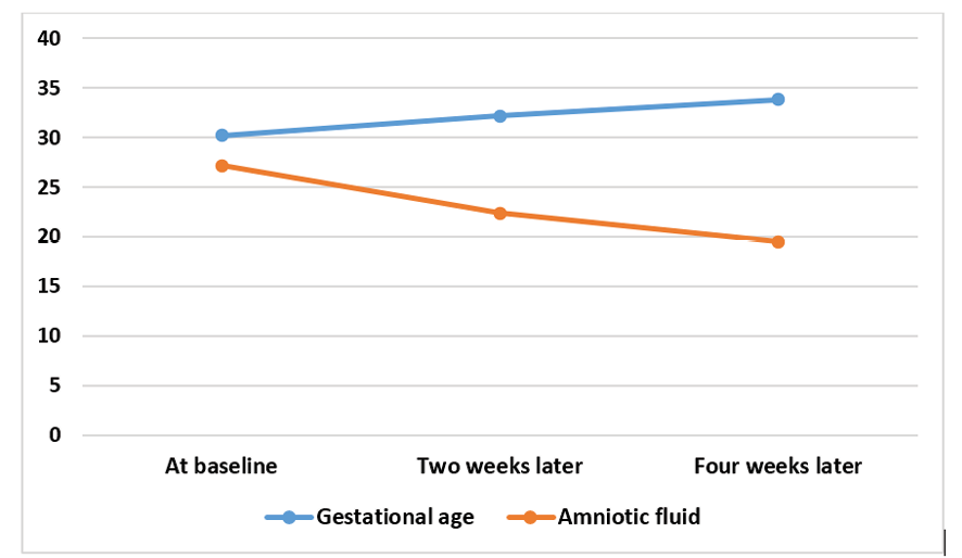 Table-3 illustrates the changes in the AFI following dietary intervention among pregnant women with polyhydramnios, categorized by gestational age. The mean AFI levels at the initial visit, and two and four weeks later, were 27.19, 22.41, and 19.5, respectively. We observed a significant reduction in AFI at both the two- and four-week marks compared to the baseline (P= 0.001). The dietary intervention led to a significant overall decrease in the AFI (baseline, 2 and 4 weeks later, P= 0.001) and specifically after two weeks of intervention (P= 0.001). However, the rate of decrease in AFI after two weeks (mean= 22.4, P= 0.001) was greater than that observed four weeks later (mean= 19.5; P= 0.004).