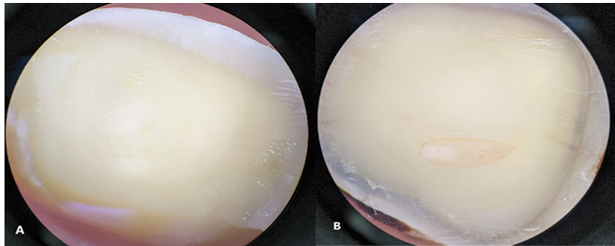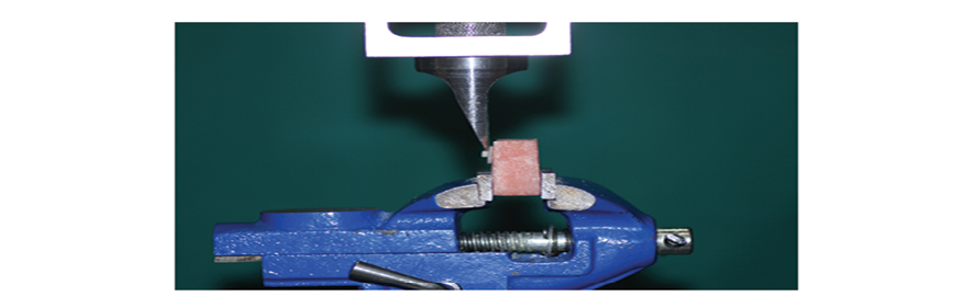 Shear bond strength (SBS) testing was performed using a knife-edge blade at a crosshead speed of 1 mm/min until failure occurred (Figure-1). A stereomicroscope (BestScope BS-3060C, China; 40× magnification) was used to examine fracture types. Two blinded observers, unaware of the restorative treatments, classified fractures as: