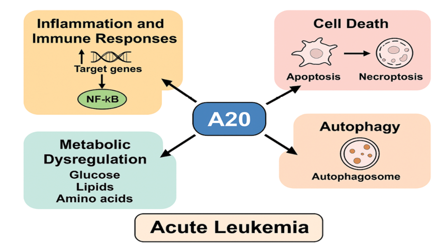 Several studies have identified mutations in the A20 gene among patients with T-cell acute lymphoblastic leukemia (T-ALL), particularly in adults. These mutations are associated with poor prognosis and may serve as biomarkers for risk stratification [14]. Additionally, decreased A20 expression has been reported in adult ALL samples [19]. In acute myeloid leukemia (AML), A20 expression patterns differ significantly between patients in complete remission and those with relapsed or drug-resistant disease, suggesting a potential role in chemoresistance [20]. Collectively, these findings suggest that A20 may serve not only as a prognostic indicator but also as a potential therapeutic target in the management of acute leukemia. It is important to note that some mechanisms of A20 action are primarily elucidated in non-leukemic contexts. Their relevance to acute leukemia remains to be fully established and warrants further investigation.