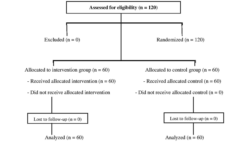This randomized controlled trial was conducted at Yixing City People’s Hospital between March 2023 and March 2024. A total of 120 elderly patients diagnosed with stable chronic obstructive pulmonary disease (COPD) were recruited for the study. Participants were randomly divided into two groups—control and intervention—each consisting of 60 patients, using a random number table for allocation. The study protocol received approval from the Ethics Committee of Yixing City People’s Hospital (Approval No. BER-YXPH-2024050), and all subjects signed informed consent forms prior to participation. This trial was prospectively registered in the Chinese Clinical Trial Registry (ChiCTR) under the registration number ChiCTR2200067819, Figure-1 shows the CONSORT flow diagram of participant enrollment, allocation, follow-up, and analysis