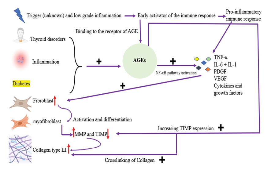 Inflammation stands as the central mechanism driving tendon dysfunction in diabetes mellitus. Persistent secretion of inflammatory agents like TNF-α and IL-6 among diabetic individuals initiates a series of inflammatory processes. This prolonged inflammatory state prompts the buildup of collagen and other extracellular matrix elements, culminating in fibrosis and subsequent impairment of tendon function [16-19].