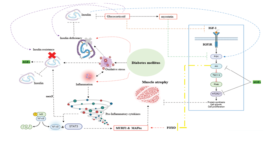 Disturbances in the primary pathways of protein degradation and synthesis are implicated in muscle atrophy. Key pathways involved in protein synthesis, such as the insulin-like growth factor-1-phosphoinositide-3-kinase-Akt/protein kinase B-mammalian target of rapamycin (IGF1-PI3K-Akt/PKB-mTOR) pathway and the IGF-1-AKT-FoxO pathways, are pivotal in this context. Dysfunctions within these pathways can result in muscle wasting and atrophy [169-176]. In type 2 diabetes, insulin resistance suppresses the IGF-1-PI3K-AKT/PKB-mTOR pathway, leading to inhibition of protein synthesis. Moreover, insulin resistance contributes to muscle atrophy by stimulating the ubiquitin-proteasome system and the autophagy-lysosome pathway through the IGF-1-AKT-FoxO signaling pathway. Conversely, in type 1 diabetes, muscle atrophy is frequently mediated by a protein degradation pathway based on FoxO [177-180]. Additionally, muscle atrophy in individuals with diabetes can also be attributed to damage caused by oxidative stress, inflammatory responses, and elevated levels of glucocorticoids [181, 182] (Figure-3).