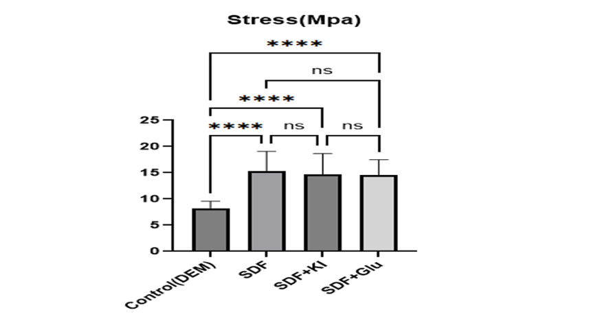 The μTBS of CR to dentin was significantly influenced by the application of SDF-based treatments compared to the untreated control group (one-way ANOVA: F=14.27, P<0.001). The control group exhibited the lowest bond strength, with a mean of 8.24 ± 1.31 MPa (range: 6.66–11.52 MPa). In contrast, all three SDF-treated groups demonstrated substantially higher bond strengths: SDF alone achieved the highest mean of 15.34 ± 3.72 MPa (range: 10.23–22.47 MPa), followed by SDF + potassium iodide (SDF+KI) at 14.68 ± 3.96 MPa (range: 11.18–25.49 MPa), and SDF + 20% glutathione (SDF+GSH) at 14.51 ± 2.97 MPa (range: 9.21–18.18 MPa). Post-hoc Tukey pairwise comparisons confirmed that each SDF-based treatment yielded significantly higher μSBS than the control (P<0.001 for all three comparisons; mean differences: 7.09 MPa for SDF vs. control, 6.43 MPa for SDF+KI vs. control, and 6.27 MPa for SDF+GSH vs. control), whereas no significant differences were observed among the three SDF-treated groups (P=0.951 for SDF vs. SDF+KI, P=0.910 for SDF vs. SDF+GSH, and P=0.999 for SDF+KI vs. SDF+GSH), as also illustrated in Figure-1.