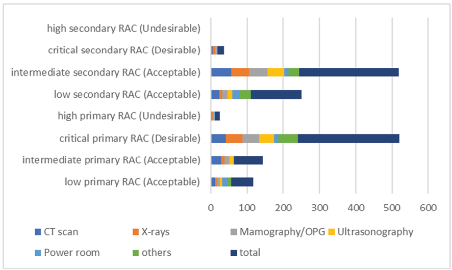 Figure-2 outlines the results of the analysis of the levels of primary and secondary risks in various units and the total. Accordingly, most of the risks are at an acceptable level after considering the effectiveness of existing controls, so that the primary undesirable risks have decreased from 281 (excluding controls) to 18 undesirable ones, and the other risks are at acceptable levels. For primary risks, the majority fall within the critical RAC (281 instances, deemed Desirable), followed by intermediate (79, Acceptable) and low (61, Acceptable), with minimal high RAC occurrences (13, Undesirable). Notably, the CT scan, X-rays, and Mammography/OPG units exhibit the highest critical primary risks (42, 46, and 46, respectively), while Ultrasonography and "others" show no high primary risks. Secondary risks predominantly align with intermediate RAC (274, Acceptable) and low RAC (141, Acceptable), with a smaller critical subset (18, Desirable) and no high RAC cases. The Power Room and "others" units display lower secondary critical risks (0 and 0), contrasting with imaging units like CT scans (6) and X-rays (6). Table-2 reports the types of energy and their sources as well as the number of risks resulting from each in the units studied. Accordingly, a total of 14 types of energy and 433 risks were identified, with electricity claiming the largest share among the types of energy with 240 cases. This covers electrical equipment, switches and sockets, cables, and electrical panels, which play a key role in all units. Furthermore, some types of energy include those related to biological, chemical, etc.