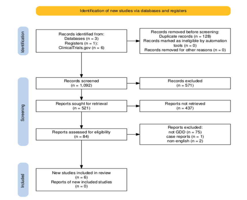 A total of 1,092 records were identified through database searching and screened by title and abstract. After removing duplicates and applying the initial screening, 84 full-text articles were assessed for eligibility. Following detailed evaluation against the predefined inclusion and exclusion criteria, six studies were finally included in this systematic review, as shown in Figure-1.
