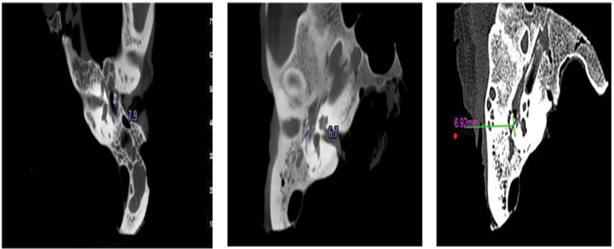 CBCT images were evaluated by a board-certified oral and maxillofacial radiologist, while MDCT images were assessed by a general radiologist, both using a 14-inch ASUS LED monitor (1920 × 1080 resolution) in a semi-darkened, controlled viewing environment. For each image, the distances between the round window and the oval window, and between the incus and the facial nerve, were measured using the digital ruler tool available within the respective CT and CBCT software platforms (see Figure-1 for illustration).