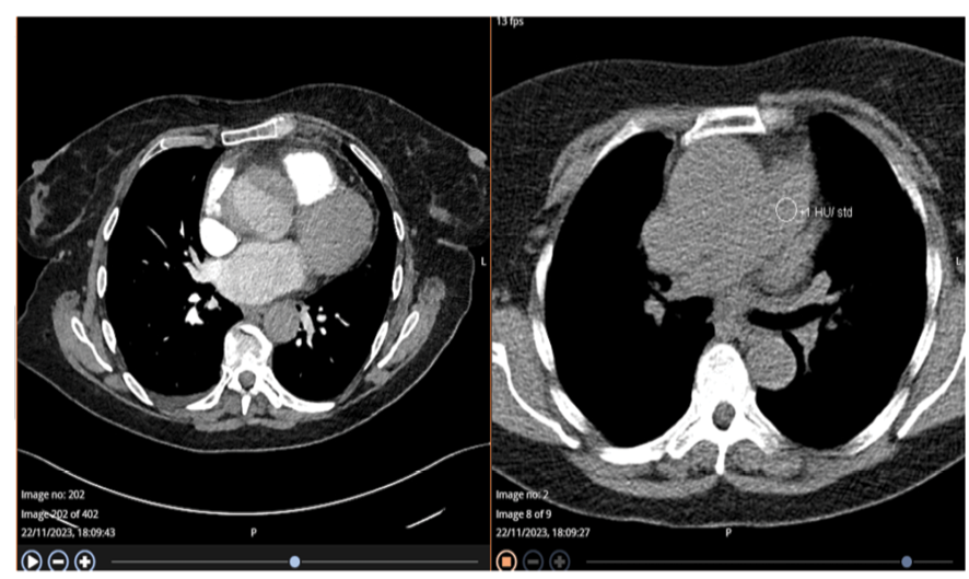 The patient was treated with Tazocin and IV fluids and had a CT scan that showed dilation of the common bile duct (CBD), no visible stones, and fluid surrounding the gallbladder along with mild thickening (Figure-1-A). These findings were indicative of acute acalculous cholecystitis, along with unexpected cardiac issues, such as an ascending aortic aneurysm and cardiomegaly (Figure-1-B). Further evaluation shifted the focus to her cardiac conditions, as the CT results regarding the gallbladder could also be influenced by heart failure.