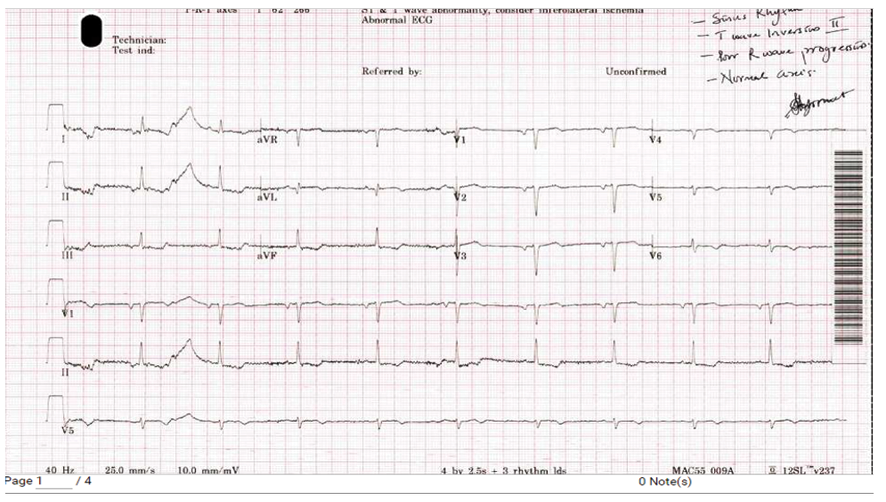 Figure 2. ECG on the first presentation showed ST depression in the inferolateral leads in addition to T wave inversion in precordial leads consistent with ischemia in the RCA territory.