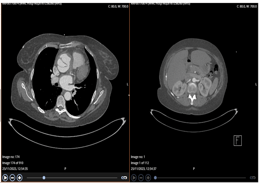 On November 22, 2023, a 53-year-old lady who had been treated with citalopram, propranolol, ramipril, and mirtazapine for more than five years for anxiety, depression, hypertension, and excessive smoking was admitted to the hospital. She was experiencing shortness of breath, abdominal pain, and palpitations. Physical examination revealed :BP=110/86 mmhg, PR=61, Sao2=99%, dyspnoea, a grade II murmur, and a tender epigastrium. Blood tests showed elevated CRP level at 214 mg/l, new-onset acute kidney injury ;evidenced by reduced kidney filtration rate and higher creatinine levels compared to results from two months prior; increased D-dimer at 1049ng/ml, and mildly elevated liver enzyme to 62U/L. Due to her shortness of breath and elevated D-dimer, the surgical team ordered a CT scan of the abdomen and pelvis, as well as a CT pulmonary angiogram.