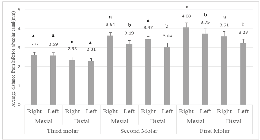 Figure 1. Average distances (mm) from mandibular molars to the inferior alveolar canal on the right and left sides, measured mesially and distally. Error bars represent standard deviations. Different letters (a, b) indicate significant differences (P<.05) based on statistical analysis.
