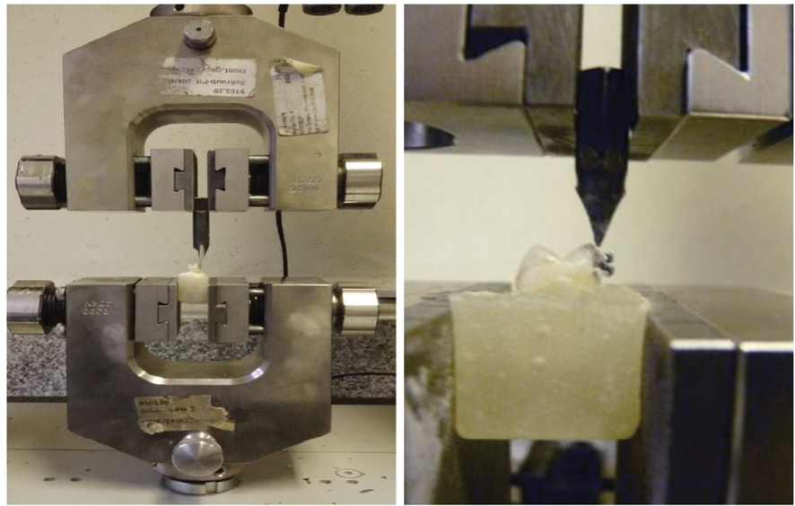 Each tooth was set in acrylic resin to ensure uniform positioning with the bracket base perpendicular to the horizontal plane. After bonding, samples were stored in water for 24 hours, underwent 1,000 thermal cycles between 5°C and 55°C, then kept in water for one week. SBS was measured using a universal testing machine, applying force at 0.5 mm/min until failure. The maximum load was recorded and divided by the bracket base area to calculate BS in MPa (Figure-1).