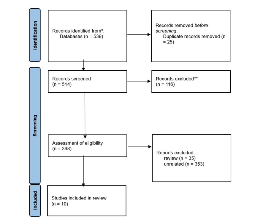Between 2015 and 2025, 539 records were identified. Based on the search keywords 398, studies were remined from records screened, and finally, based on Figure-1, 10 records were included in the study [10-19].