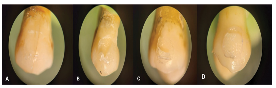After bracket debonding, the buccal surface of the teeth was inspected under a stereomicroscope (SMZ800, Nikon, Japan) at x10 magnification, and the ARI score was determined according to Artun and Bergland [16] as follows (Figure-1): Score 0 indicates no adhesive remaining on the enamel surface; Score 1 indicates less than 50% of adhesive remaining on the enamel surface; Score 2 indicates more than 50% of adhesive remaining on the enamel surface; and Score 3 indicates all adhesive remaining on the enamel surface.