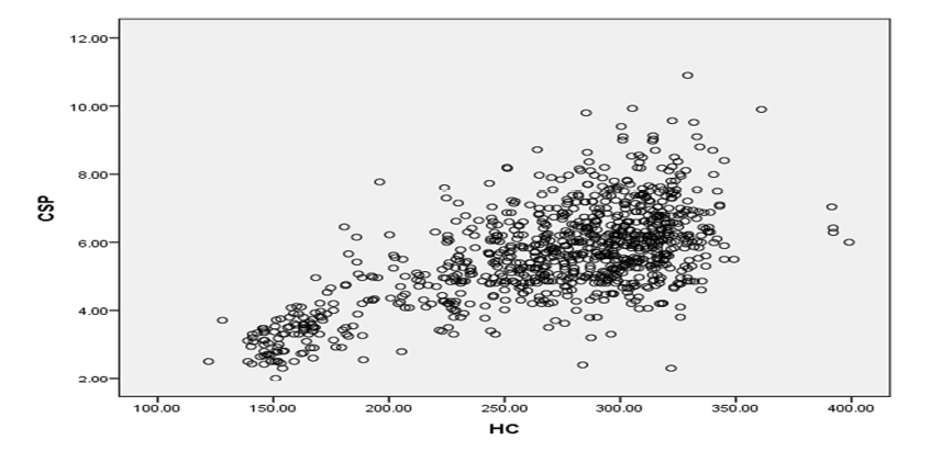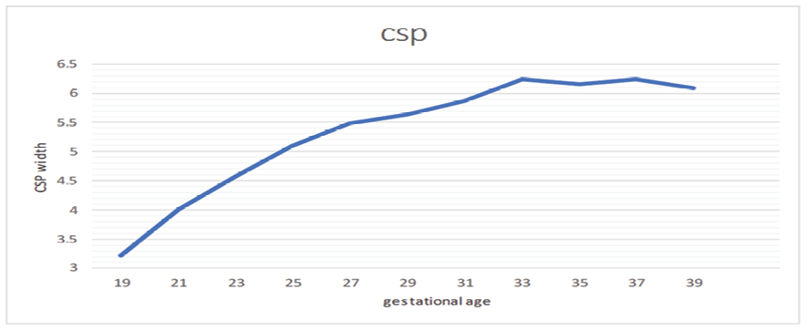 Pearson correlation test revealed significant statistical correlation between CSP width and HC (r=0.644, P-value<0.01), and CSP width and BPP (r=0.631, P-value<0.01), as shown in Figure -3 and -4. The percentiles (5th, 10th, 25th, 50th, 75th, 90th) show a general increase in CSP width with advancing GA, though with some fluctuations. For example, the median (50th percentile) CSP width grows from 3.325 mm at 18–20 weeks to 6.17 mm at 36–38 weeks, before slightly decreasing to 5.705 mm at 38–40 weeks. Variability is evident in higher percentiles, with the 90th percentile peaking at 8.124 mm (36–38 weeks). Table-3 presents the CSP length-to-width ratio across different percentiles (5th, 25th, 50th, 75th, 90th, 95th), showing a progressive increase. The median ratio is 1.53, rising to 2.0 at the 90th percentile and 2.2 at the 95th percentile, indicating that CSP morphology becomes more elongated in higher percentiles.