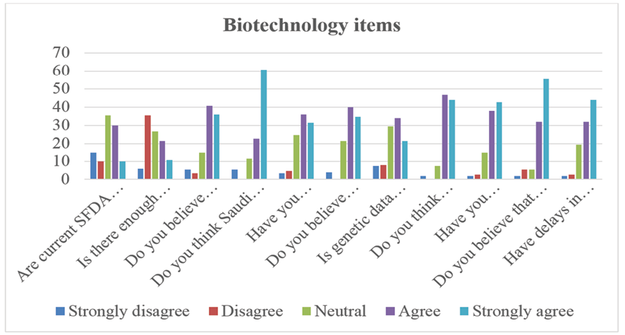 Data were collected using a validated, structured, self-administered questionnaire developed specifically for this research, distributed to biotechnology professionals in Saudi Arabia. The questionnaire design was informed by an extensive review of the literature and strategic national documents, particularly Vision 2030 priorities for biotechnology [5]. The instrument, the survey, consisted of two main sections: the first collected demographic information, including gender, role, years of experience, field of expertise, and institution type; the second assessed perceptions on regulations, innovation, manufacturing, and import challenges in 7 questions as shown in Table-1. Participants rated their agreement with statements using a five-point Likert scale ranging from “Strongly Disagree” to “Strongly Agree.” The reliability of the questionnaire was confirmed with a Cronbach’s alpha of 0.795, indicating good internal consistency.