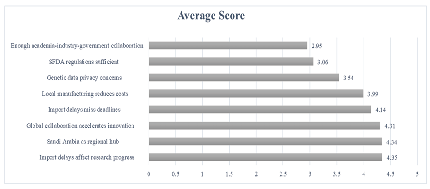 The highest agreement was observed for "Do you believe that importation delays significantly affect research progress in genetic testing?" (M=4.35, SD=0.91), followed closely by "Do you think Saudi Arabia can become a regional hub for genetic testing and precision medicine?" (M=4.34, SD=0.89) and "Do you think increased collaboration between Saudi biotech companies and global genetic research institutions would accelerate innovation in the country?" (M=4.31, SD=0.79). Conversely, the lowest agreement was reported for "Is there enough collaboration between academia, industry, and government to advance genetic testing?" (M=2.95, SD=1.12), indicating a perceived lack of interdisciplinary cooperation. Other notable findings included strong support for local manufacturing reducing costs (M=3.99, SD=0.98) and concerns over importation delays affecting deadlines (M=4.14, SD=0.94). detailed scores are shown in Figure-1.
