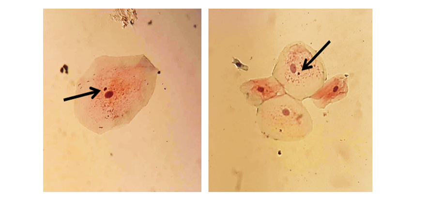 Cytological sampling of the buccal mucosa was performed as follows: Subjects first rinsed their mouths twice with running water. Mucosal cells were then gently collected with a disposable plastic brush and immediately smeared onto clean glass slides. The slides were fixed using a cytology fixative spray (NamiraCyte, Bahar Afshan, Iran) and stained using the Papanicolaou (PAP stain) method. Micronuclei were counted in a total of one thousand cells per sample under a light microscope (Zeiss, Germany) at 400× magnification. Only isolated cells with clear margins and well-defined nuclei were evaluated. Micronuclei were identified as follows: they exhibited the same coloration as the nucleus, were adjacent to the main nucleus, measured between one-third and one-fifth of the nucleus diameter, and were devoid of any connection to the nucleus [4]. (Figure-1)