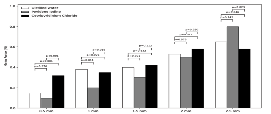 The mean force of NiTi wire was the highest in the CPC group at all intervals during the loading phase (the required force for wire engagement in the bracket). During the unloading phase (force applied by the wire to the teeth during the course of orthodontic treatment), the mean wire force was the highest in the CPC group at 0.5 and 1 mm, and in the PI group at 2 mm bending point. During the loading phase, CPC increased the force in NiTi wires at all points while PI increased the force at 0.5- and 2-mm intervals compared to the distilled water group. During the unloading phase, CPC increased force at 0.5 and 1 mm, and PI increased force at 2.5 mm point compared with the distilled water group. According to the present results, it appears that 0.05% CPC and 1% PI increase the loading and unloading forces; this effect may be due to the protective role of the titanium oxide layer, which is formed within a short period of time and prevents wire surface corrosion. Subsequently, the unloading forces serve as a reciprocating force and when the orthodontic wire returns to its original shape, it affects the periodontal ligament and tooth movement biomechanics [43]. It appears that in treatment with NiTi wires, use of CPC and PI mouthwashes can improve clinical performance. Similarly, Mlinaric et al. [44] compared the effects of hyaluronic-acid based edible disinfectants and chlorhexidine on NiTi wires and reported that they did not damage the titanium oxide protective layer and had no adverse effect on the properties of NiTi wires. The pH of mouthwashes is another important parameter, which can affect the corrosion resistance of wires. A more acidic pH can cause a greater reduction in mechanical force of orthodontic wires [14]. More acidic solutions with a lower pH further penetrate into the protective coating of NiTi wires and increase wire corrosion. CPC has a pH of around 6.5 [45]. Unlike the present results, Alavi et al. [14] showed that daily use of a fluoride mouthwash with a higher acidity (pH of 4) caused greater reduction of mechanical properties of NiTi wires in the unloading phase. Difference between their results and the present findings can be due to using a different solution with a different concentration and a more acidic pH in their study, compared with the present investigation.