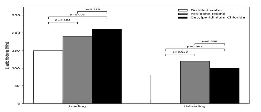 Stiffer wires have a higher modulus of elasticity [49]. In the present study, 0.05% CPC and 1% PI increased the modulus of elasticity of NiTi wires during the loading phase compared with distilled water. During the unloading phase, 1% PI yielded the highest modulus of elasticity. Thus, CPC and PI increased the stiffness and corrosion resistance of the NiTi wire. This result was expected considering the increase in force and flexural strength of wire in the CPC and PI groups. Unlike the present results, Mlinaric et al. [44] showed insignificant effect of hyaluronic-acid based disinfectants, chlorhexidine, and Listerine on the modulus of elasticity of uncoated NiTi wires, and those with nitride and rhodium coatings. This difference can be due to their coatings and different types of mouthwashes used, which is more important than the type of coating [44].